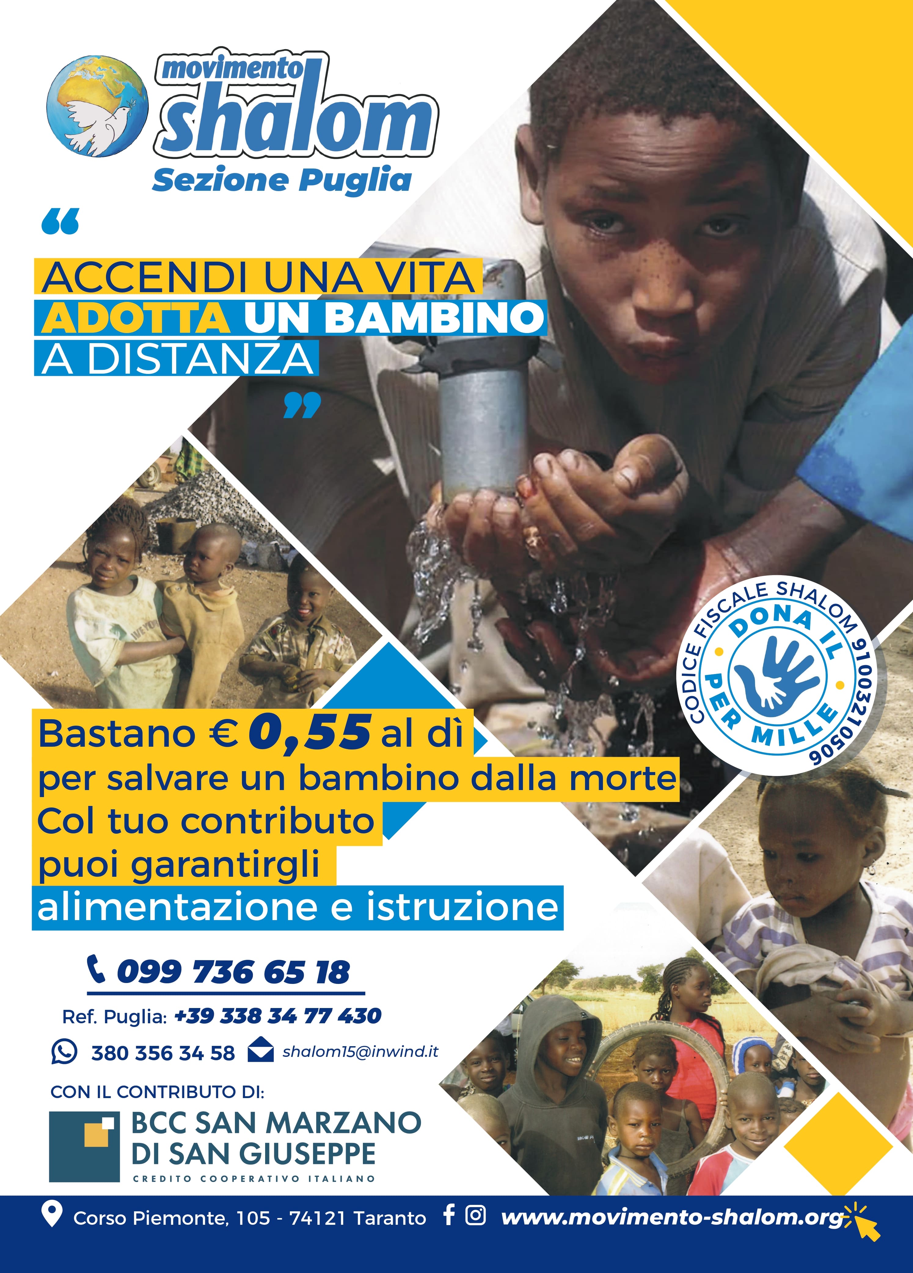E’ sufficiente scaricare il modulo on line, compilarlo ed inviarlo alla sede Shalom di Taranto, unitamente alla ricevuta del bonifico bancario effettuato con il versamento della prima retta di sostegno a distanza per la creatura.